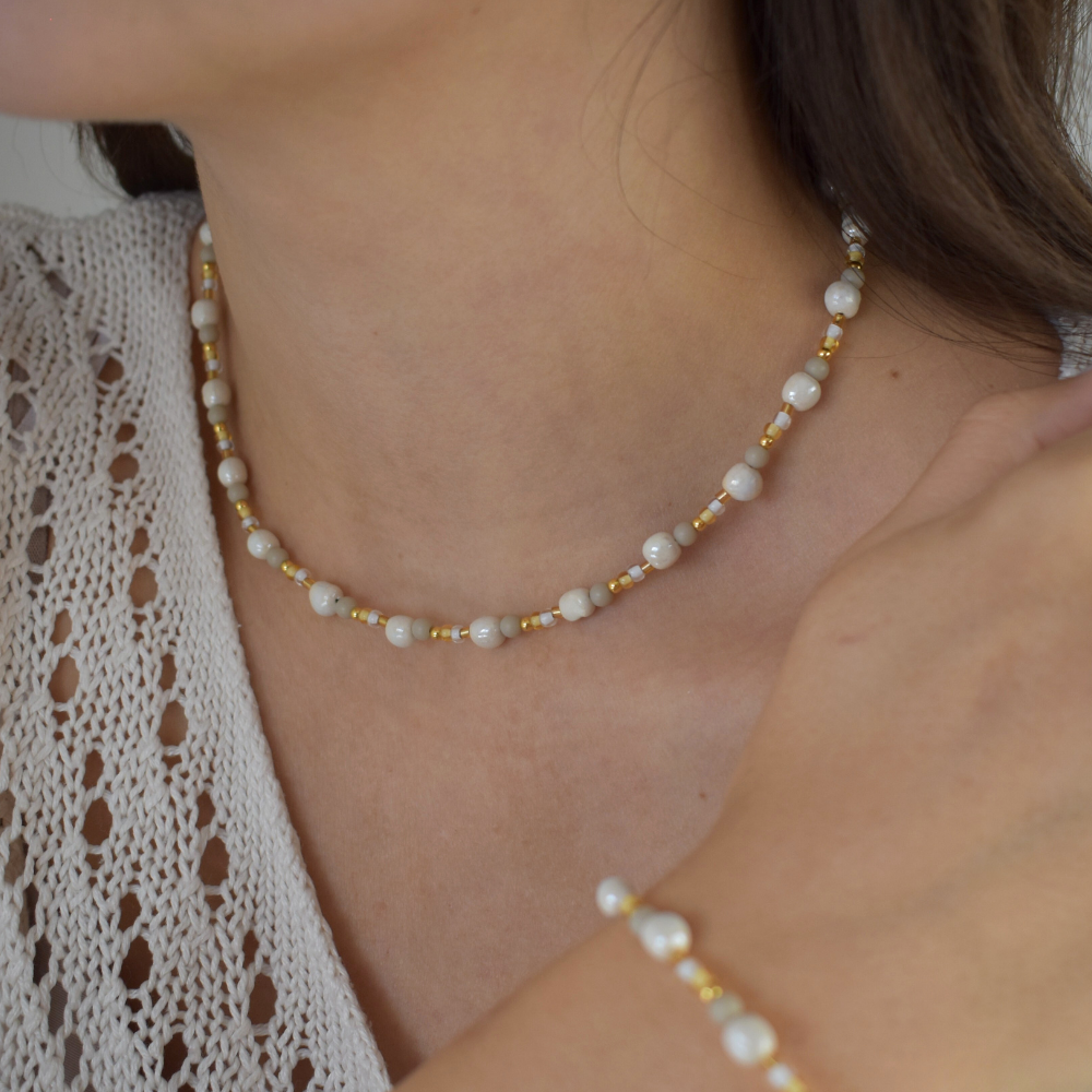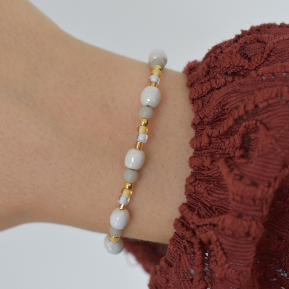Das Armband Vayana lebt von feinen Kontrasten und einer lockeren Perlenanordnung. Es lässt sich leicht kombinieren und ergänzt sowohl schlichte als auch sommerlichere Looks mühelos.