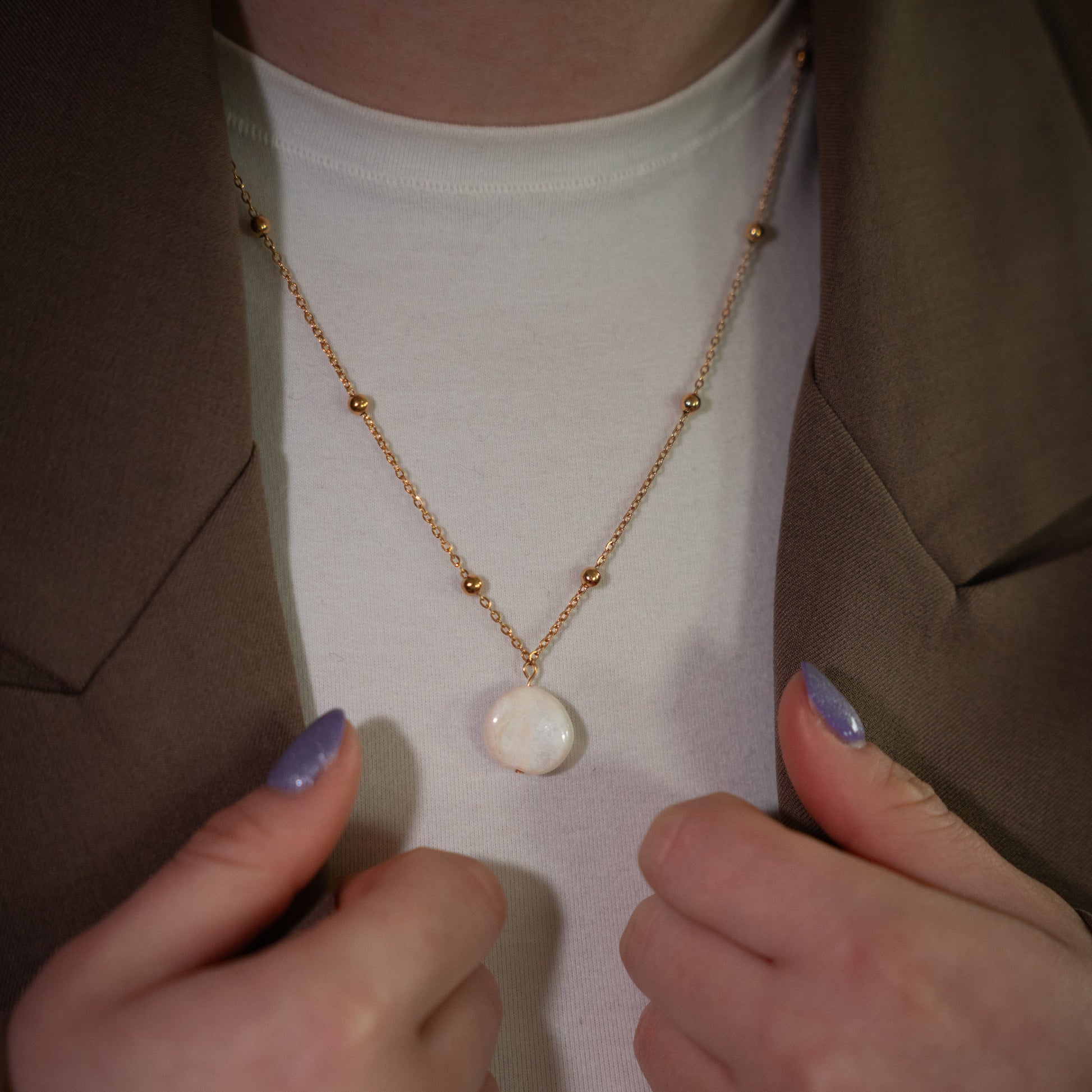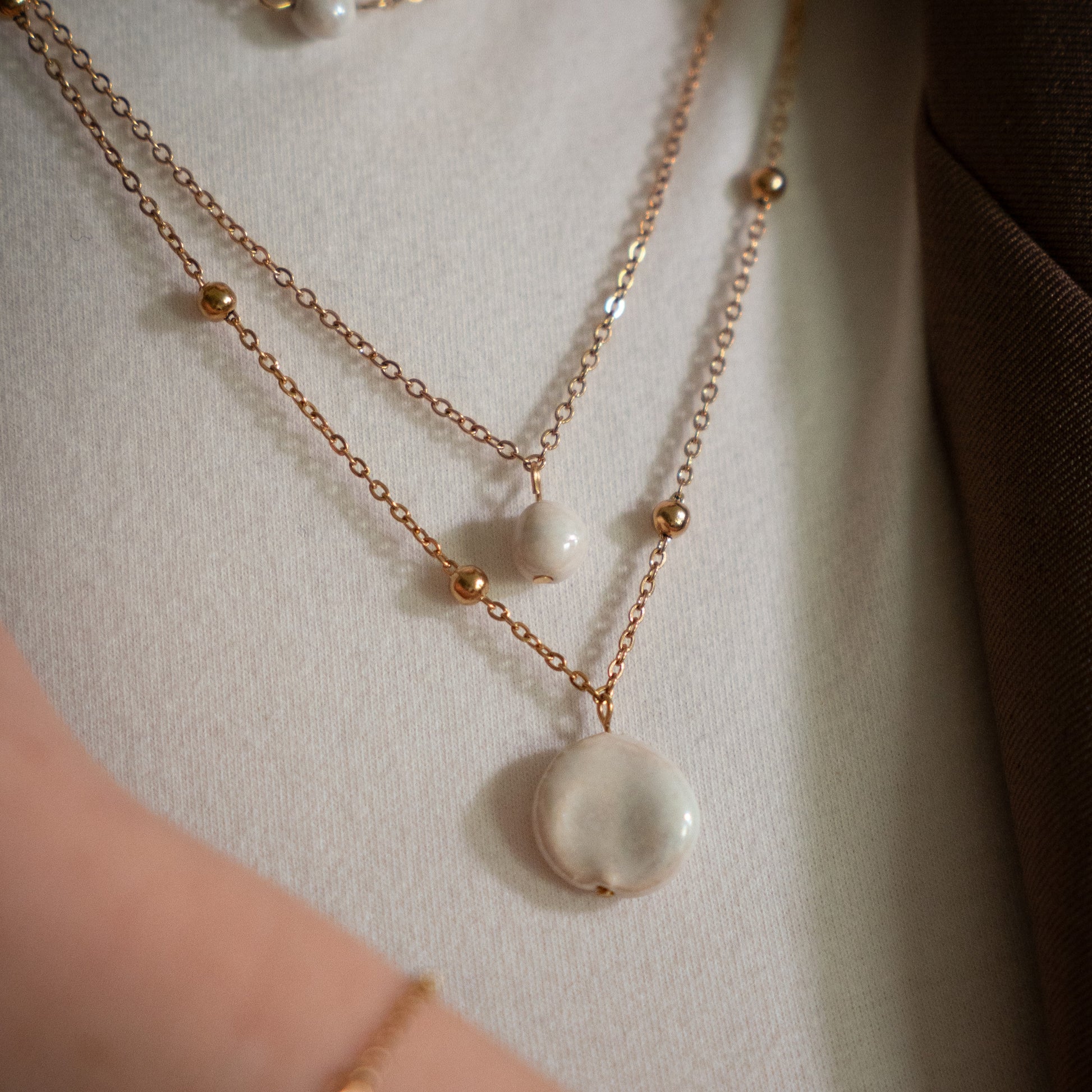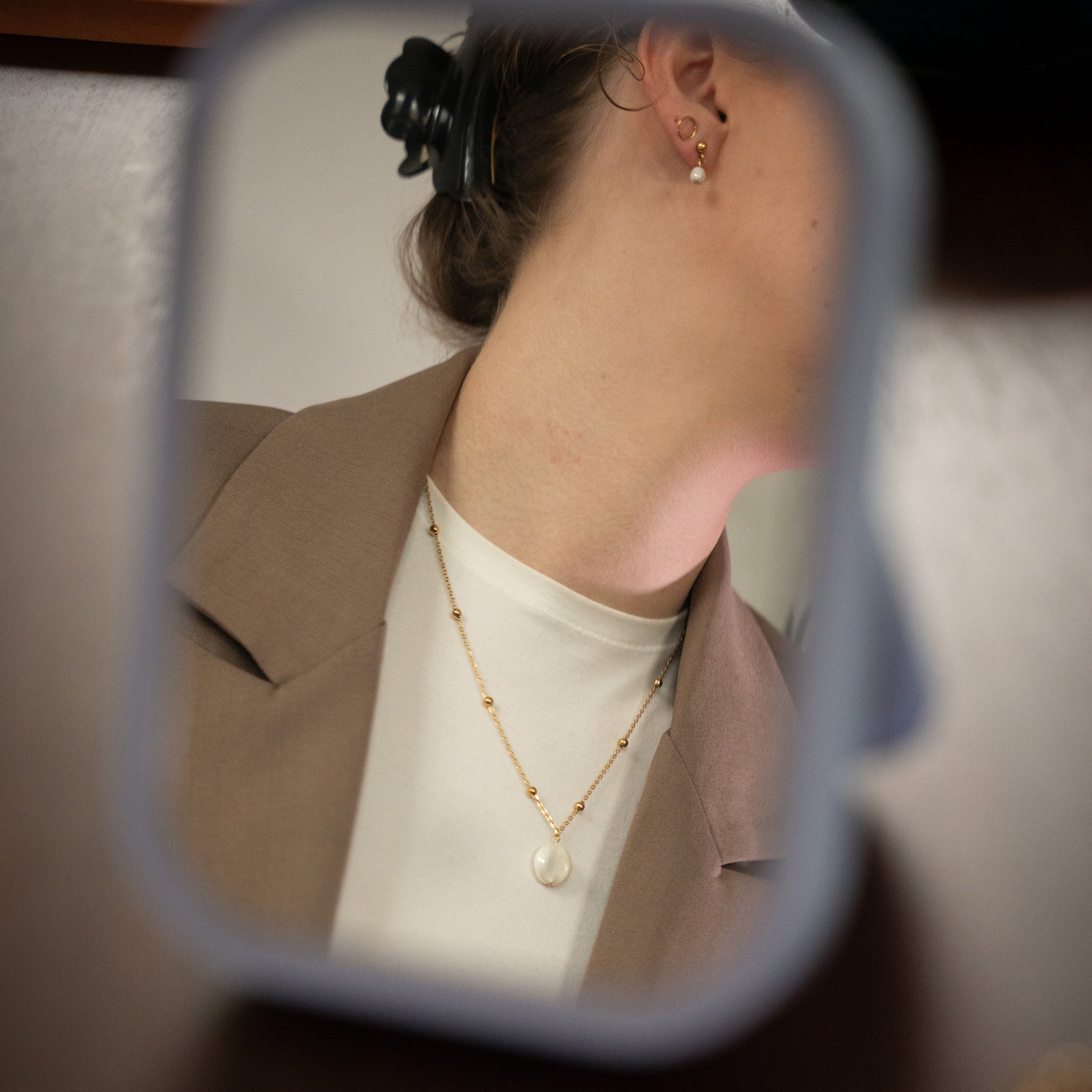 Die Halskette Soléa trägt einen organisch geformten und dezent glänzenden Perlenanhänger. Ob einzeln getragen oder im Layering kombiniert - sie ergänzt verschiedene Looks ruhig und unaufdringlich und passt zu Alltag wie auch zu besonderen Outfits.
