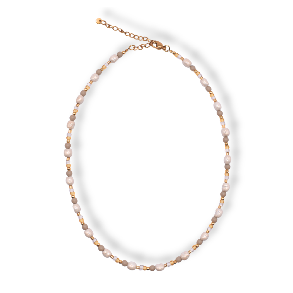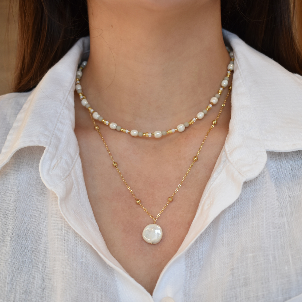 Die Halskette Vayana kombiniert zart schimmernde Perlen zu einem lockeren, harmonischen Gesamtbild. Sie wirkt lebendiger als klassische Perlenketten, bleibt dabei dezent und lässt sich besonders schön im Layering tragen - zum Beispiel in Kombination mit Soléa.