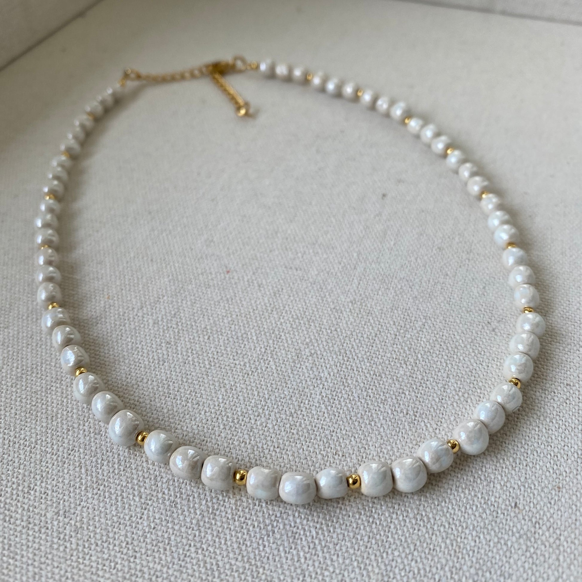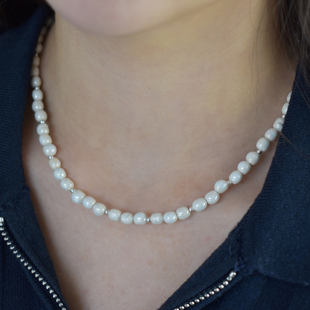 Vegane Keramikperlen - handgeformt, glasiert & bewusst individuell. Frei von tierischen Bestandteilen, Plastik und Nickel. Die Perlen sind wasserresistent und halten gelegentlichen Kontakt mit Wasser (z. B. beim Händewaschen oder einer kurzen Dusche) gut aus. Um den ursprünglichen Schimmer langfristig zu erhalten, empfehlen wir jedoch, den Schmuck vor längerem Kontakt mit Wasser, Salzwasser, Chlor oder beim Eincremen abzulegen. Erfahre hier mehr über die Herstellung.