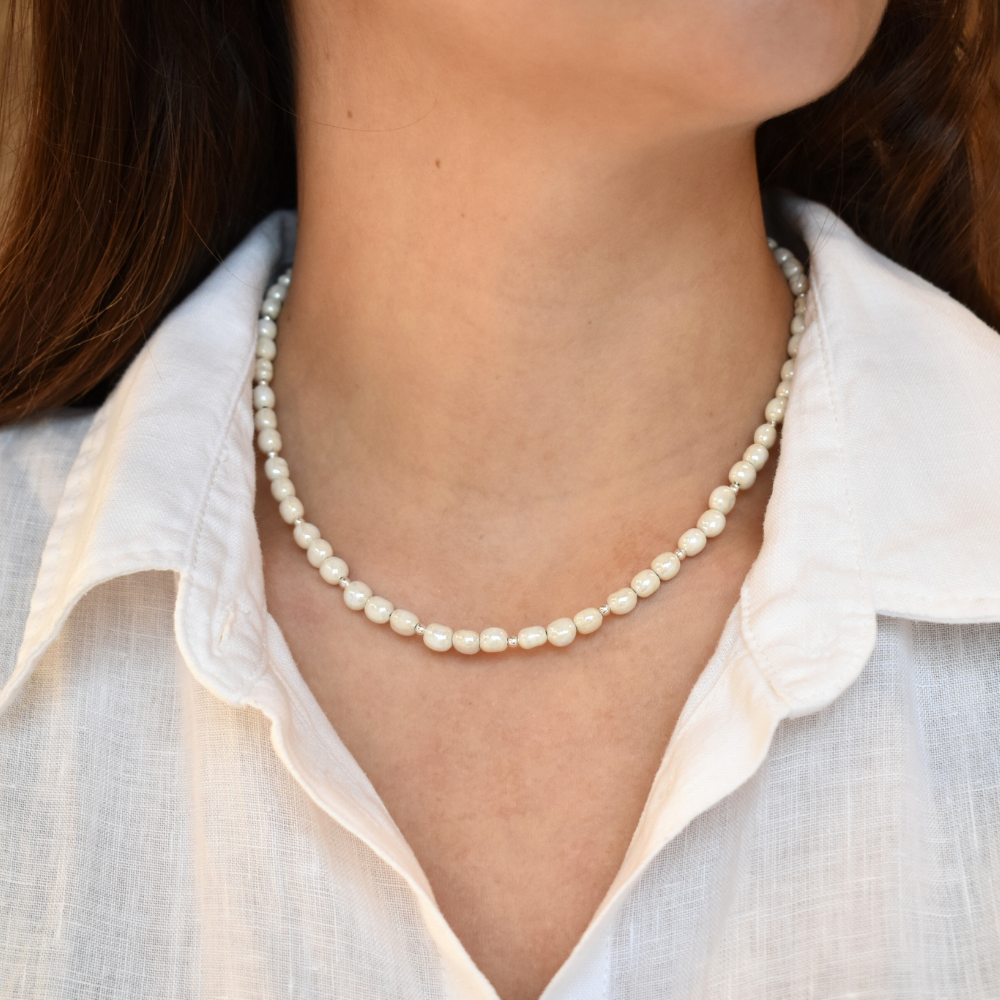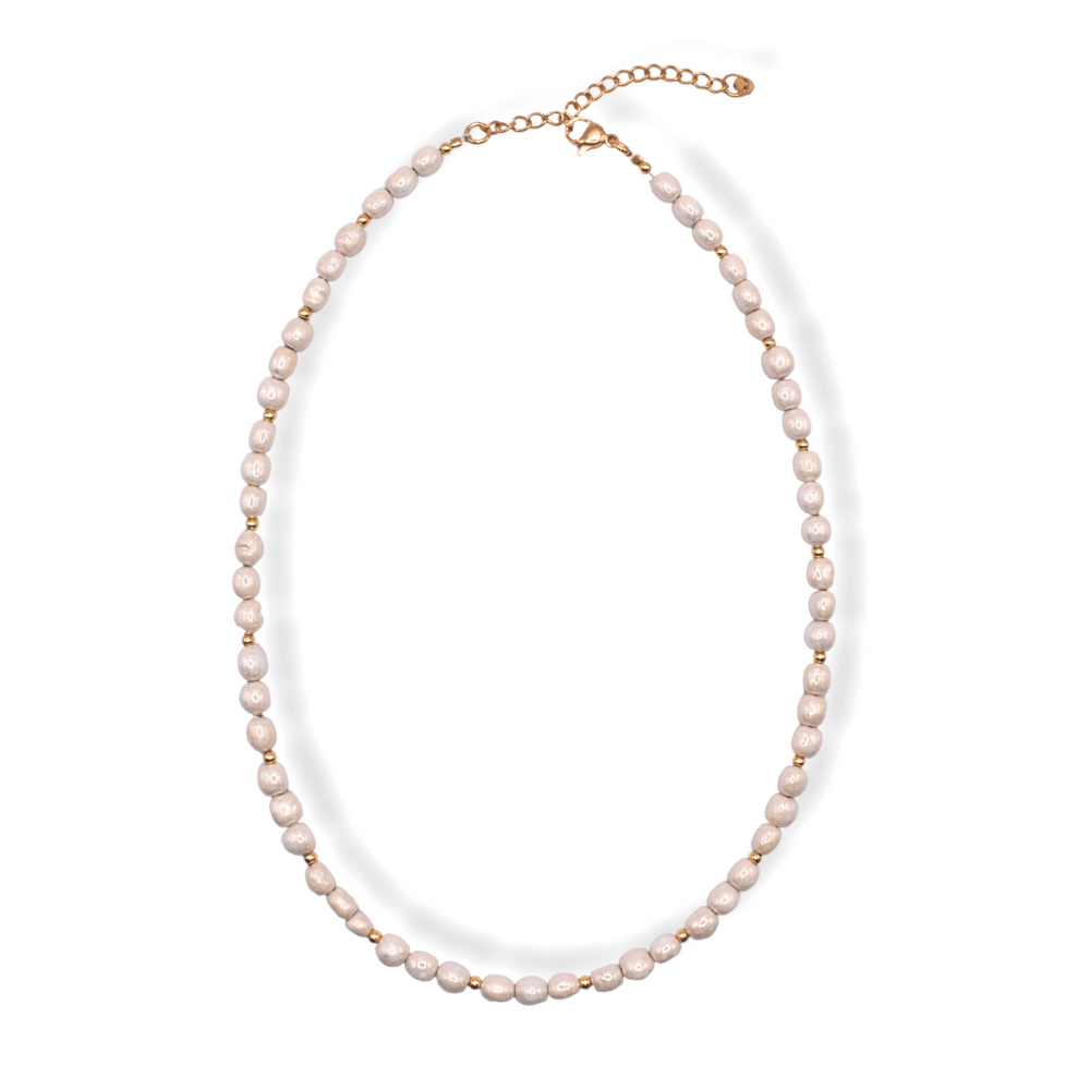 Die Halskette Véa greift die zeitlose Eleganz von Perlen auf und übersetzt sie in ein reduziertes, modernes Design. Handgefertigte vegane Perlen verleihen jedem Schmuckstück eine individuelle Note und machen die Kette vielseitig kombinierbar.